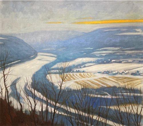 "Winter Riverscape- French Azilum. PA" Oil on linen on panel 18" x 20". $1800
