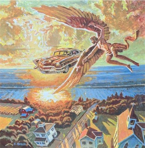 "Seneca Icarus and Flyby Pontiac piloted by Daedalus". Egg tempera on aluminum panel 16" x 16". $1800